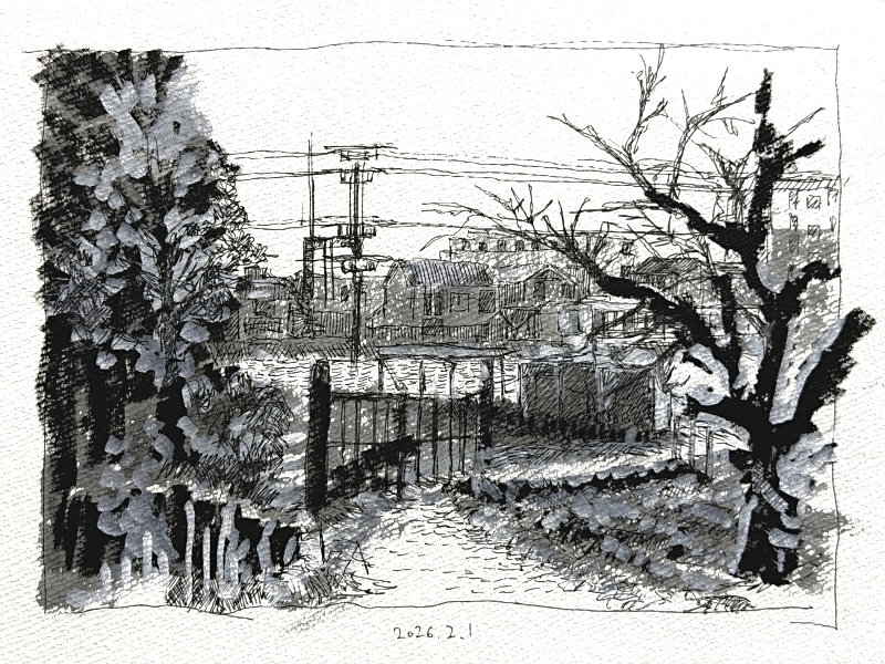 少しだけ習作していました。使用画材は普段通りのケント紙・黒インクに加え、今回はポスカの白・黒、薄墨ペンなどを用いています。モチーフは風景スケッチの過去作です(実際に現地で描いていたもの)。